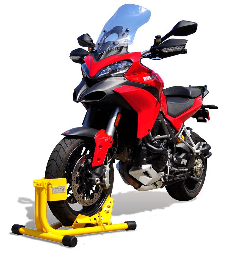 We have used the Baxley Sport Chock for years. This is a great product for any full size sport bike or supermoto. Colors come in and out of stock on a regular basis, but orders will ship immediately when in stock. Only ships to the lower 48 states in the USA.