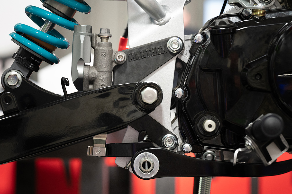 This is the kit used on our CRF110 Super Moto, converted to Grom swingarm, brakes, and wheels. The Markeforged printed bracket is carbon fiber. It requires you trim the back of your OEM brake lever off, and weld on the included brake arm as shown.